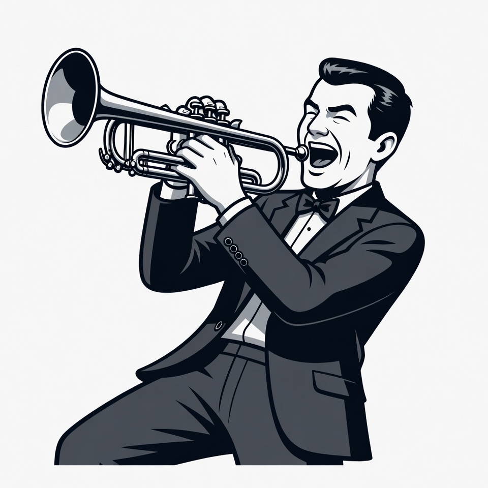 A cartoon man in a black tuxedo and bow tie plays a trumpet energetically. He has short dark hair, wide-open mouth, and intense expression while holding the brass instrument with both hands. The illustration features bold black lines on a white background.