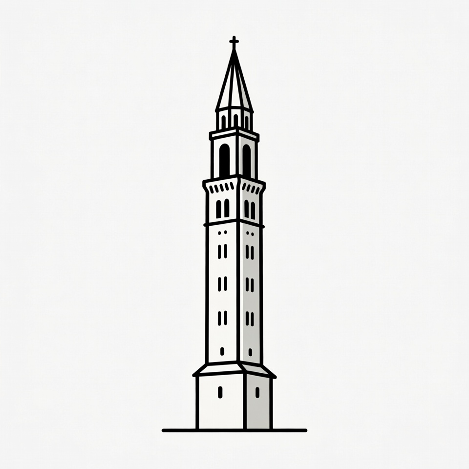A simple black line drawing of a tall church steeple with a pointed spire and cross on top. The structure features arched windows and multiple tiers narrowing upward. It stands isolated on a white background.