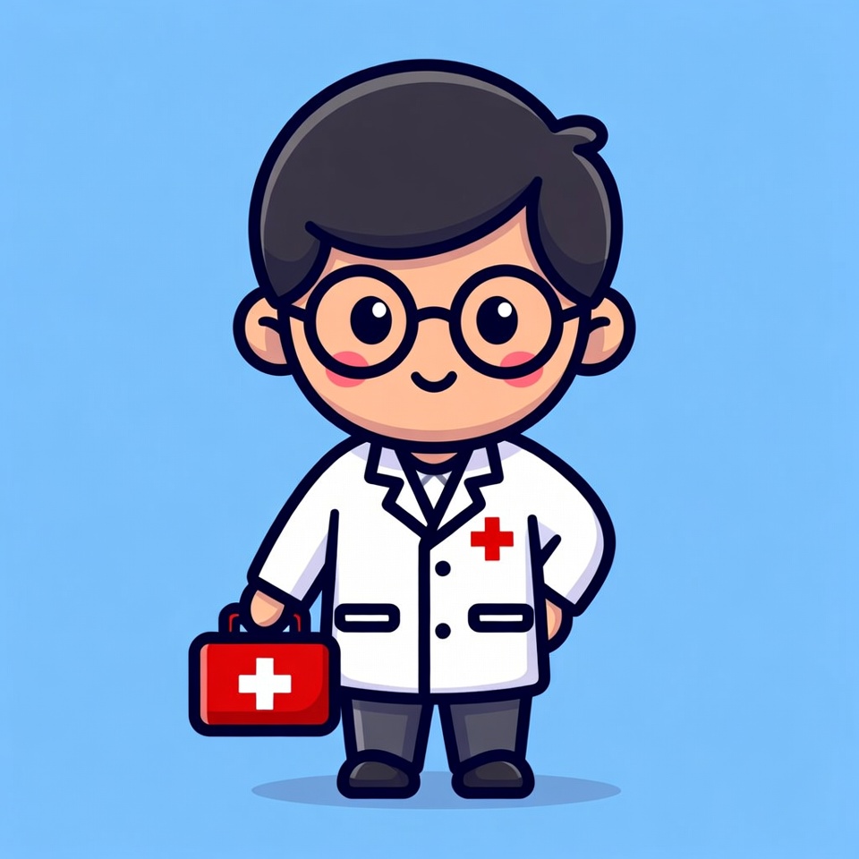 A cute cartoon Asian boy dressed as a doctor wears a white lab coat with a red cross and glasses. He holds a red first aid kit in his right hand and stands smiling on a blue background. The illustration features chibi-style with big eyes and black hair.