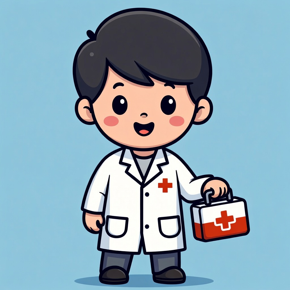 A cute cartoon boy with black hair wears a white lab coat with a red cross and holds a red first aid kit. He stands smiling on a plain blue background. His large expressive eyes and cheerful expression add to the illustration's charm.