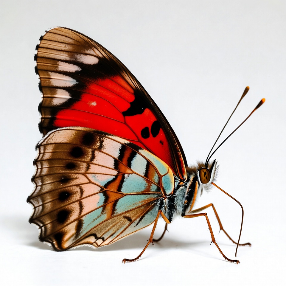 A vibrant butterfly with red, brown, and blue wings spreads its wings on a plain white background. The wings feature intricate patterns of spots and gradients. Fine antennae extend from its detailed head.