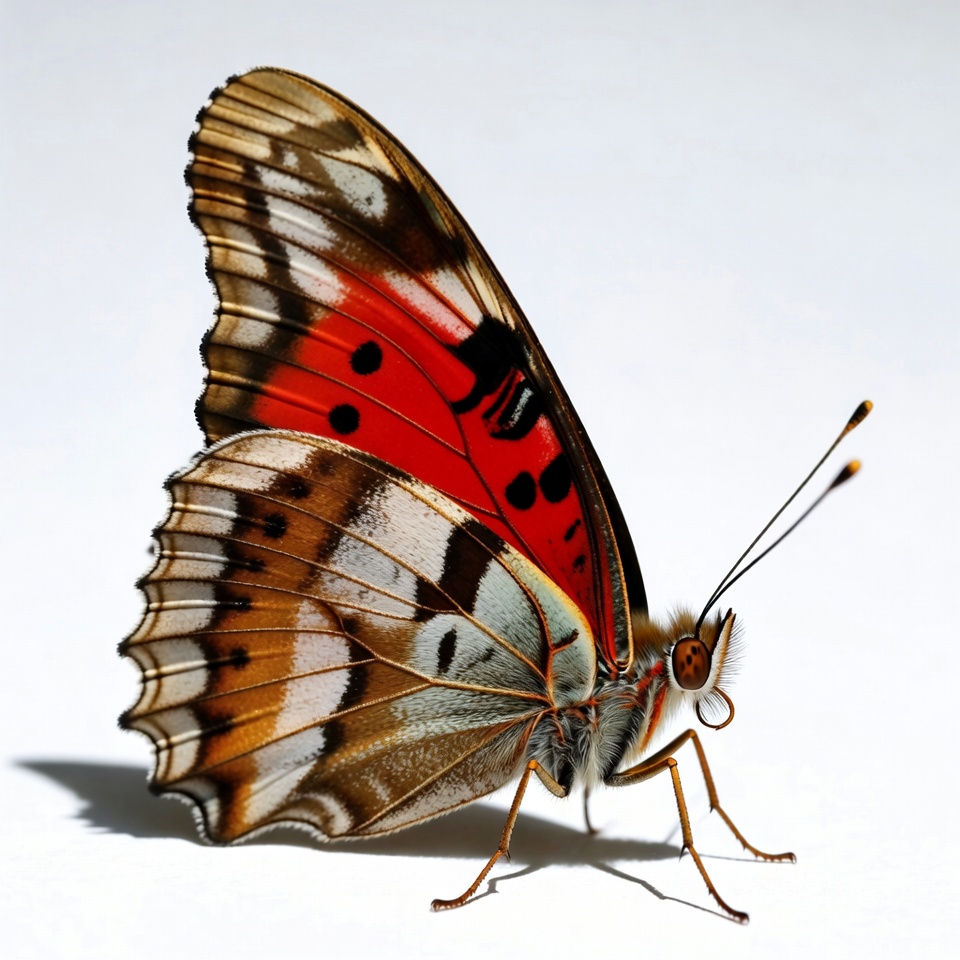 A vibrant buckeye butterfly with orange-red wings featuring black spots and white bands is perched on a plain white surface. Its wings are partially open, showcasing intricate patterns of brown, cream, and eye-like markings. Delicate antennae and slender legs are visible in sharp detail.