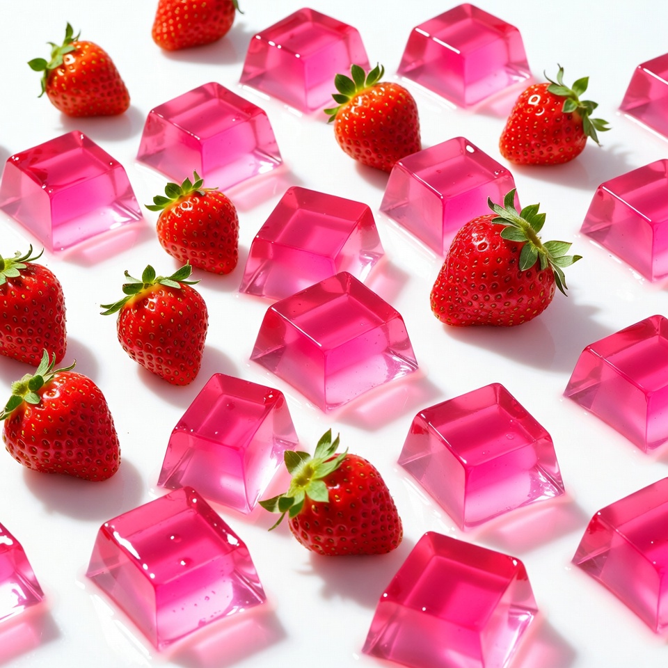 Fresh red strawberries are arranged alongside translucent pink jelly cubes on a white background. The vibrant fruits and jiggly gelatin pieces create a colorful food composition. Multiple strawberries and cubes are scattered in a balanced pattern.