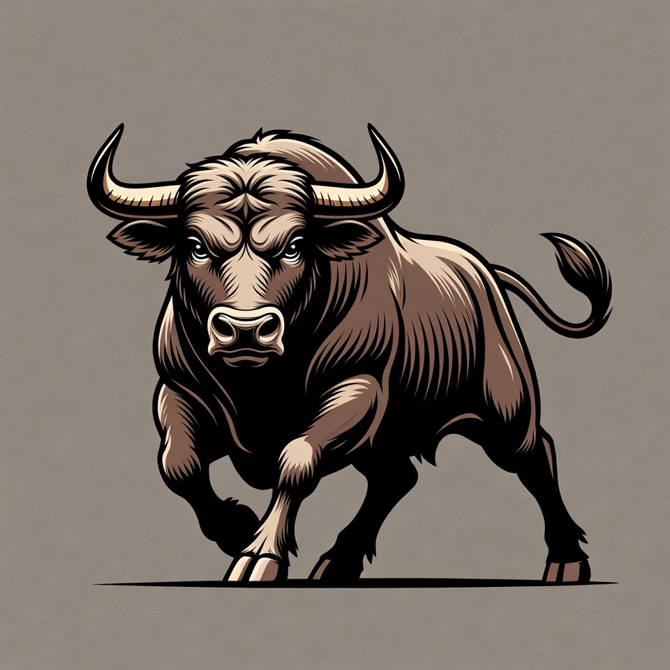 A detailed vector illustration of a powerful bull charging forward with curved horns and intense expression. The bull features muscular legs, a swinging tail, and textured fur in earthy brown tones. It is set against a plain gray background.