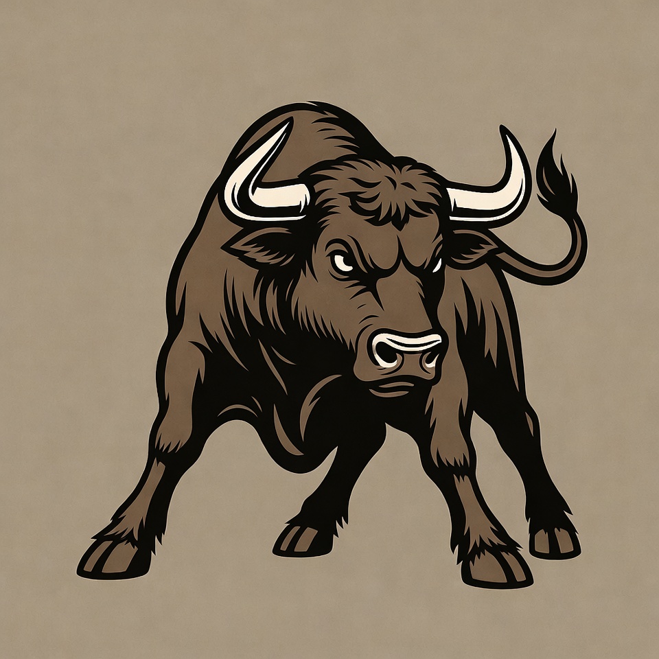 A fierce brown bull illustration stands aggressively on a beige background. It features large curved horns, intense eyes, flared nostrils, and a muscular body with detailed fur texture. The bull's tail is raised and legs are positioned in a charging stance.