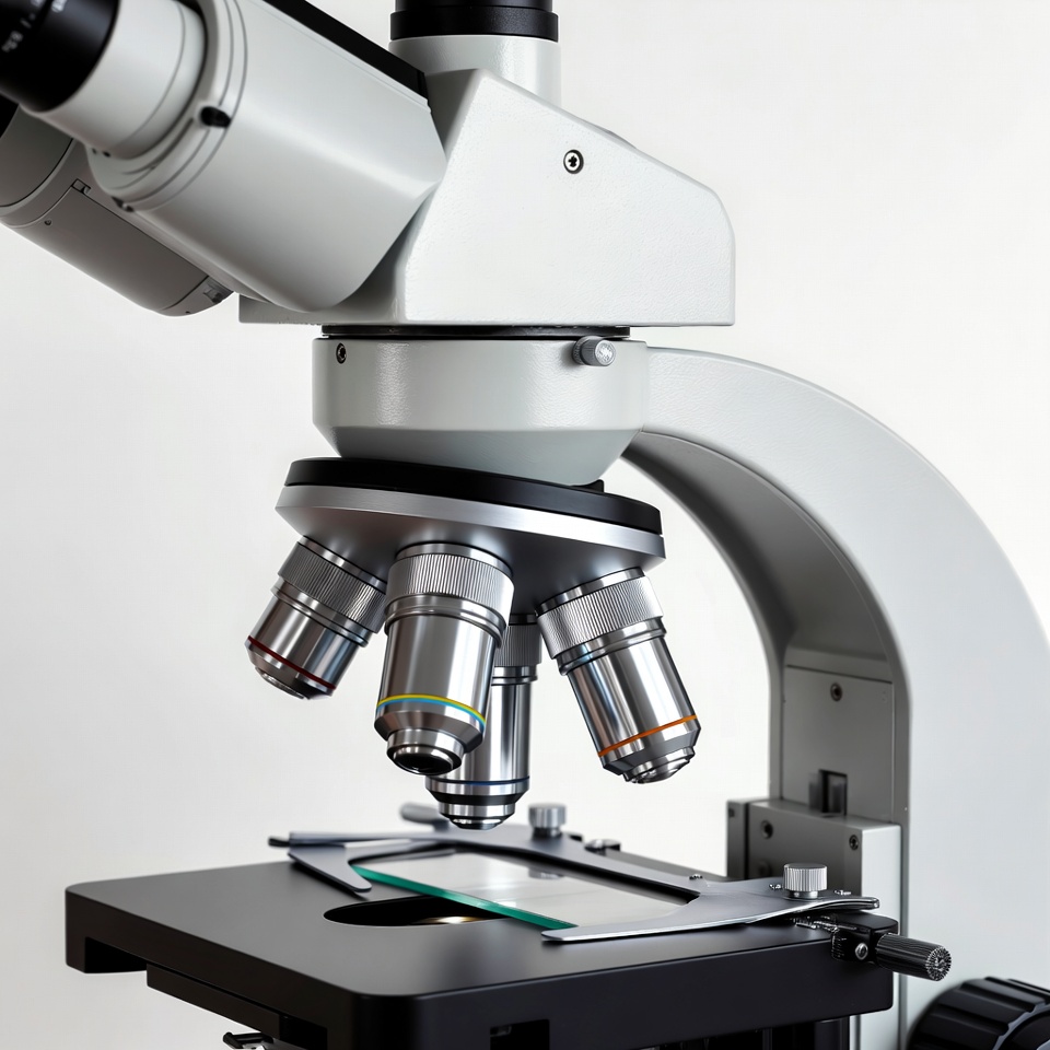 binocular microscope, biology equipment, compound microscope, eyepieces, glass slide, isolated microscope, lab microscope, laboratory equipment, microscope stage, microscopy, objective lenses, research tool, science tool, scientific instrument, white background, microscope