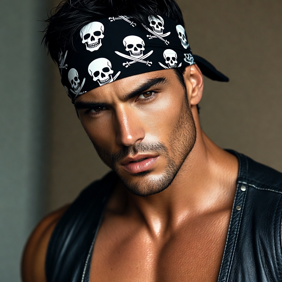 Latino, beard, black bandana, crossbones bandana, dark hair, handsome man, headshot portrait, intense eyes, isolated background, leather vest, male, muscular man, pirate bandana, serious expression, shirtless chest, skull bandana, stubble, tanned skin, toned muscles, man
