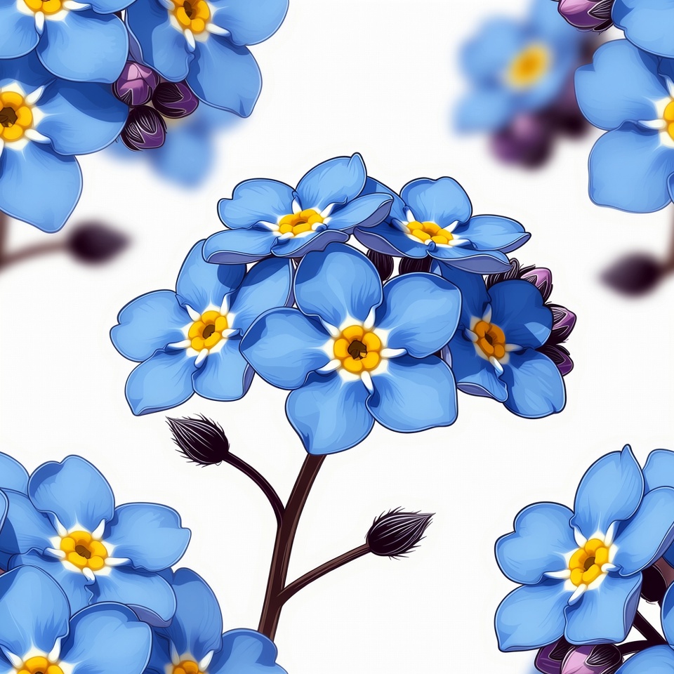 blue flowers, botanical, clipart, digital art, floral pattern, flower clusters, flowers, illustration, isolated background, nature, purple buds, repeating pattern, seamless pattern, white background, yellow centers, forget-me-not