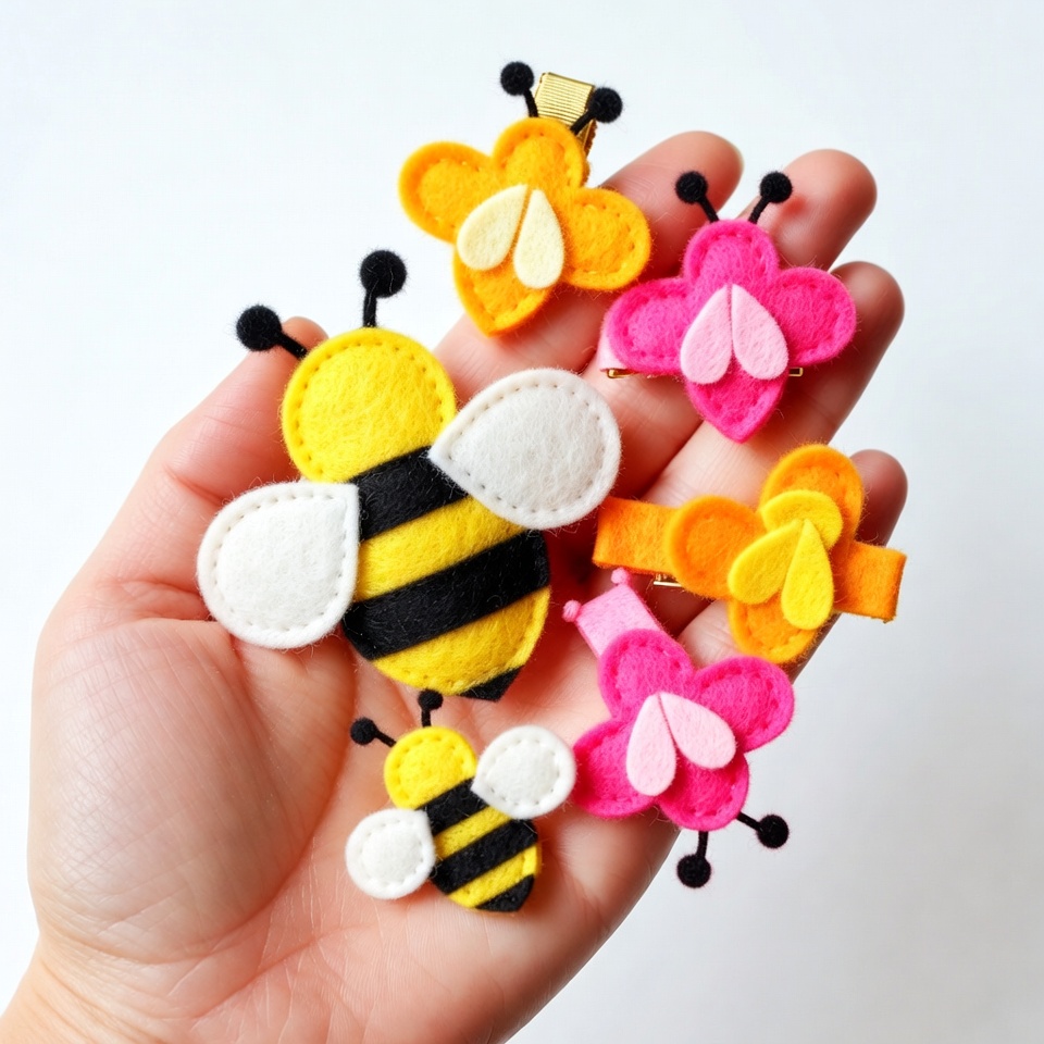 Hand holding colorful felt bee hair clips