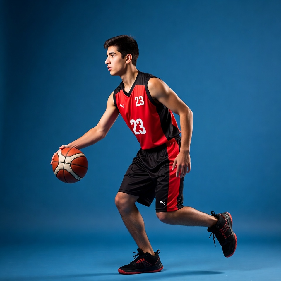 Latino, PUMA, action pose, athlete, basketball shorts, black jersey, blue background, dribbling basketball, isolated background, jersey, male, man, number 23, red jersey, sneakers, sports, teenager, young man, basketball