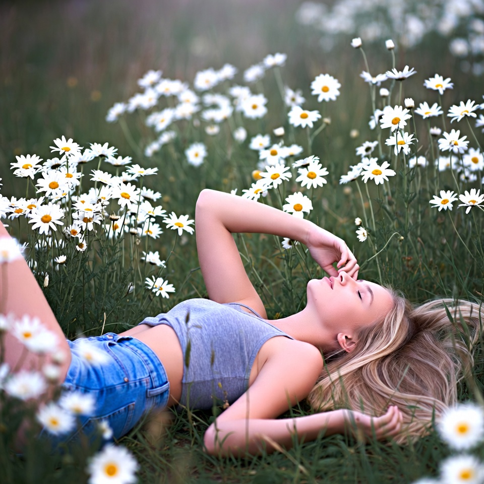 A young blonde woman with long hair lies relaxed on her back in a lush green field filled with white daisies. She wears a gray crop top and blue denim shorts, with one hand gently touching her face and eyes closed. The scene features a soft bokeh background of blooming flowers.