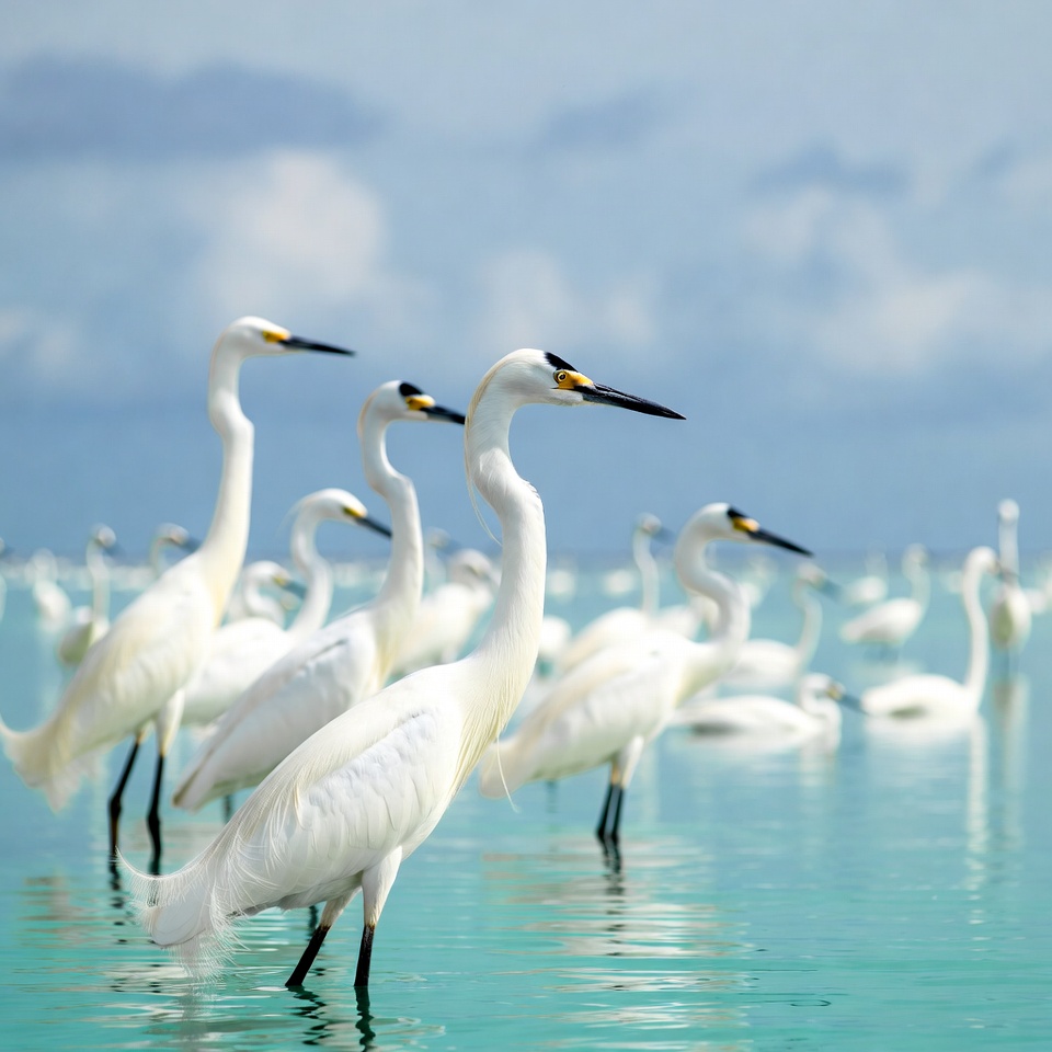 beaks, birds, clouds, feathers, flock, group birds, herons, long necks, nature, shallow water, sky, standing birds, turquoise water, wading birds, water birds, white egrets, wildlife, yellow bills, egrets