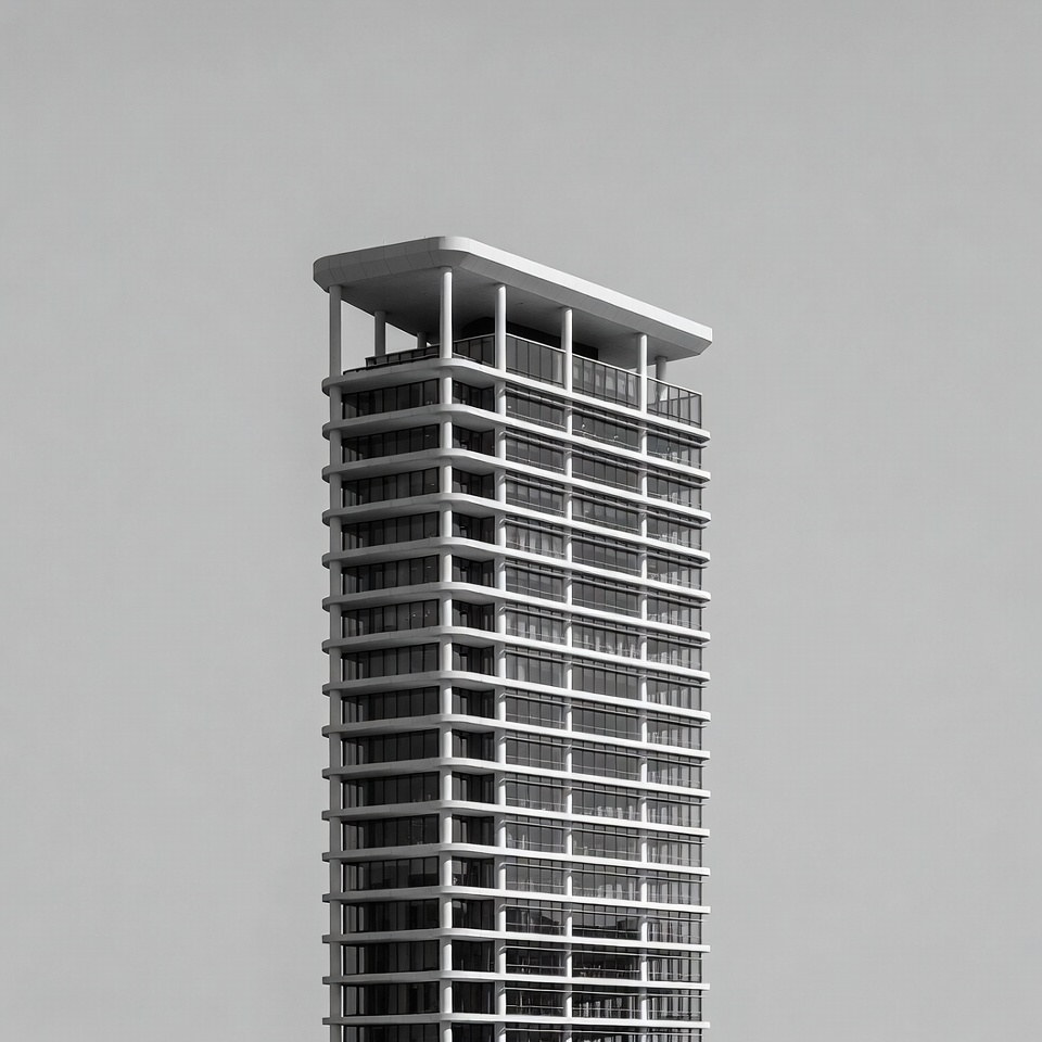 A tall modern skyscraper with curved white balconies and glass windows stands against a plain gray sky. The building features a distinctive flat roof with overhanging edges and multiple stacked floors. It is captured in black and white with clean architectural lines.