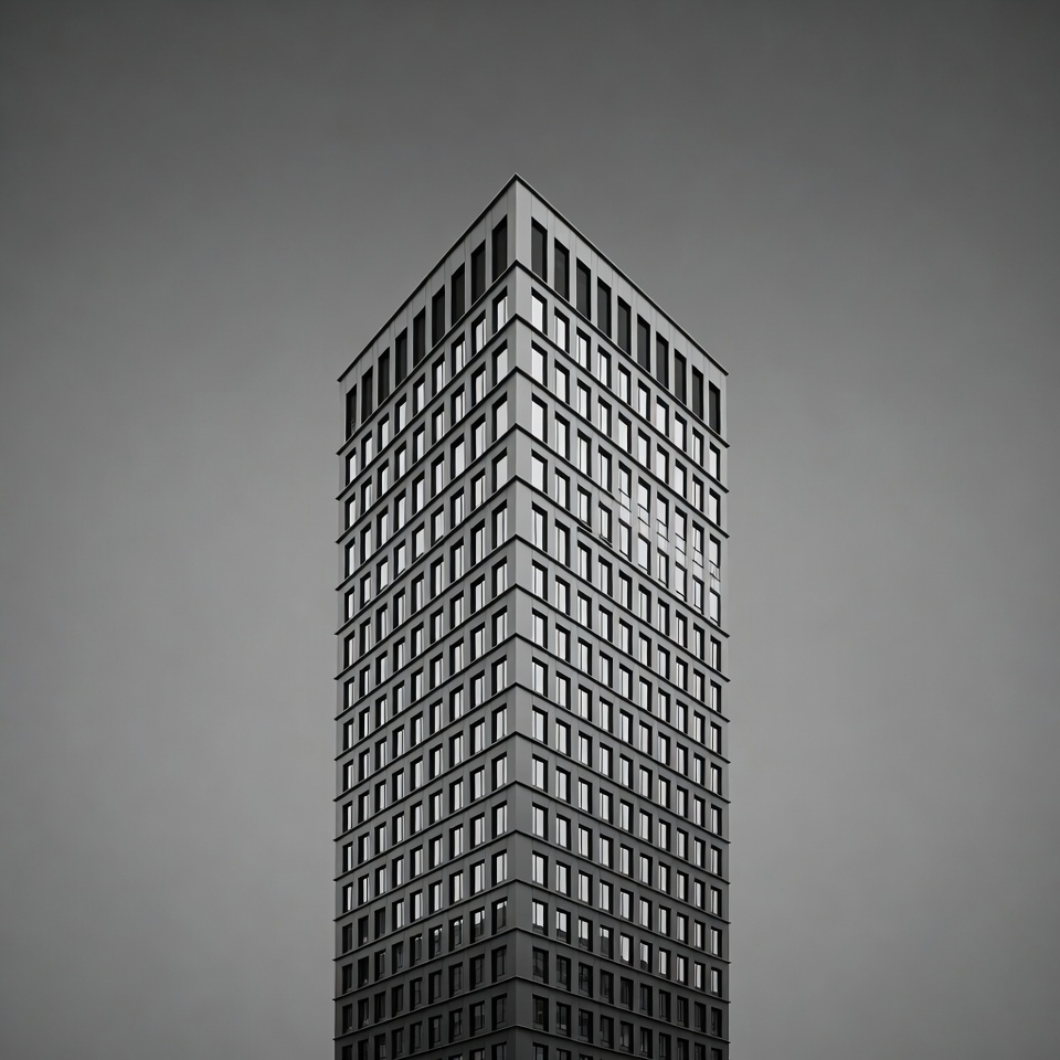 A tall modern skyscraper stands prominently against a gray sky. The building features a grid of numerous rectangular windows and clean geometric lines. It is captured in black and white with a minimalist composition.