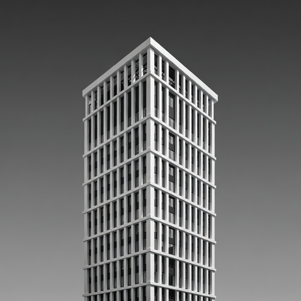 A tall modern building with a white facade and grid-like window frames stands against a dark gray sky. The structure features repetitive vertical and horizontal lines creating a minimalist architectural design. It is captured in black and white with an isolated background.