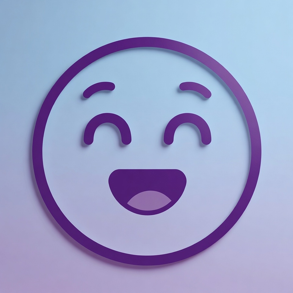 3D illustration, blue background, cartoon face, clipart, emoji, gradient shading, happy face, isolated background, joyful expression, open mouth, purple emoji, purple outline, smiling emoji, squinted eyes, laughing emoji