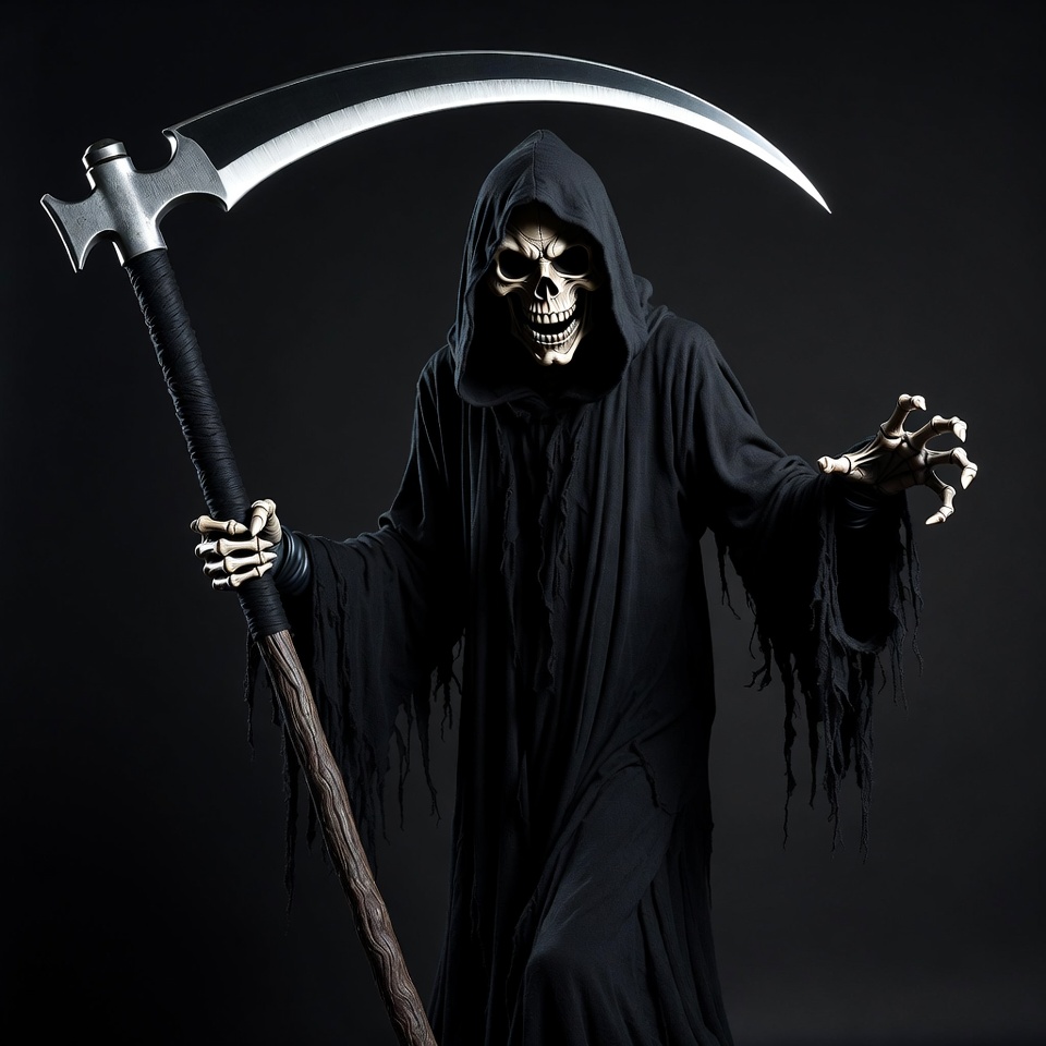 A skeletal Grim Reaper in a tattered black hooded cloak holds a large silver scythe with a wooden handle. The figure stands in a menacing pose with claw-like hands extended on a dark isolated background. The skull face and flowing robes create a spooky Halloween image.