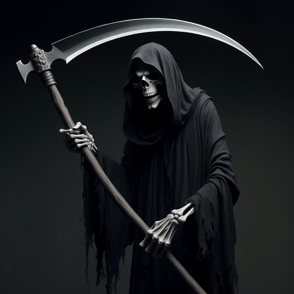 A skeletal Grim Reaper in a tattered black hooded cloak holds a large ornate scythe with bony hands. The figure stands menacingly against a dark background, with a prominent skull face visible under the hood. The scythe features intricate details on its handle and blade.