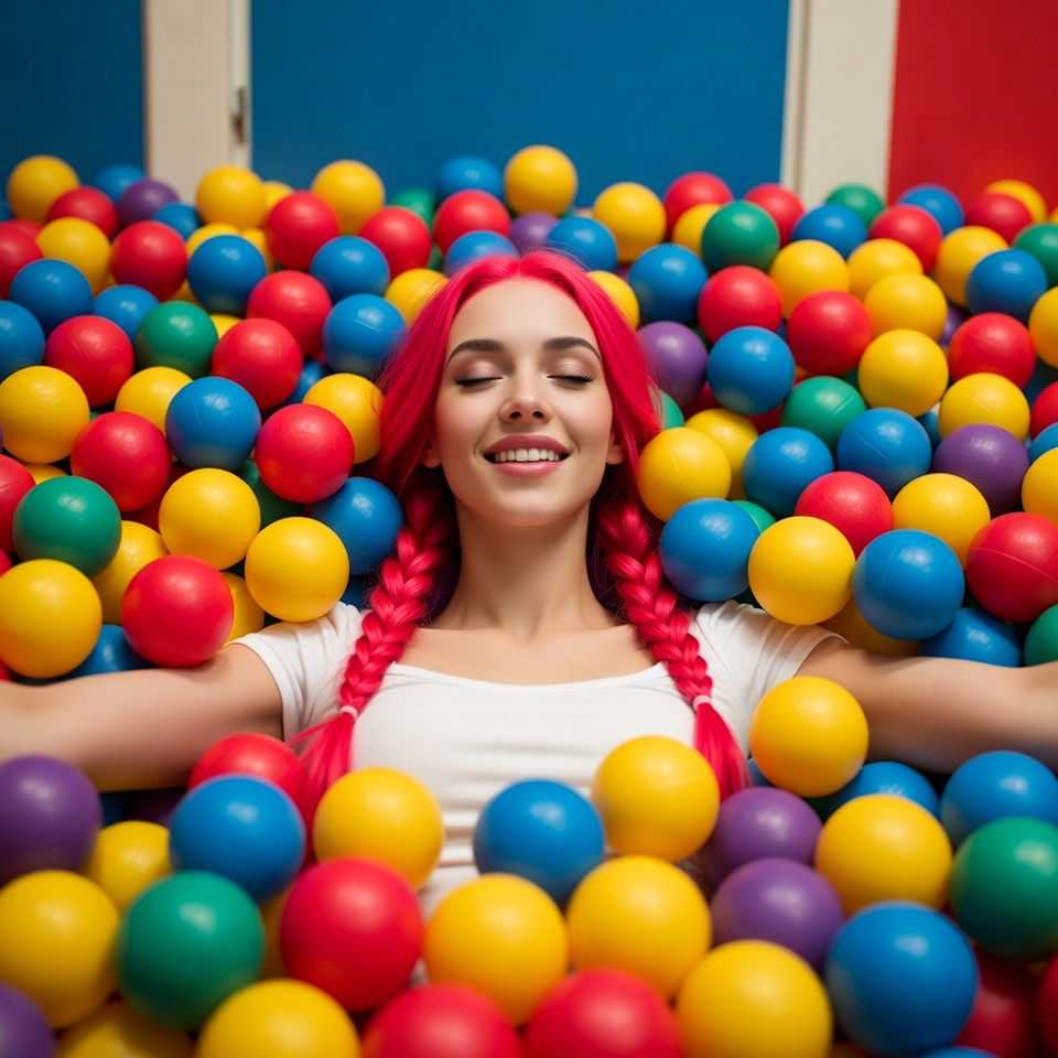 White, arms outstretched, ball pit, blue balls, braids, colorful balls, female, happy expression, indoor, lying down, pink hair, plastic balls, play area, purple balls, red balls, smiling, vibrant colors, white shirt, yellow balls, woman