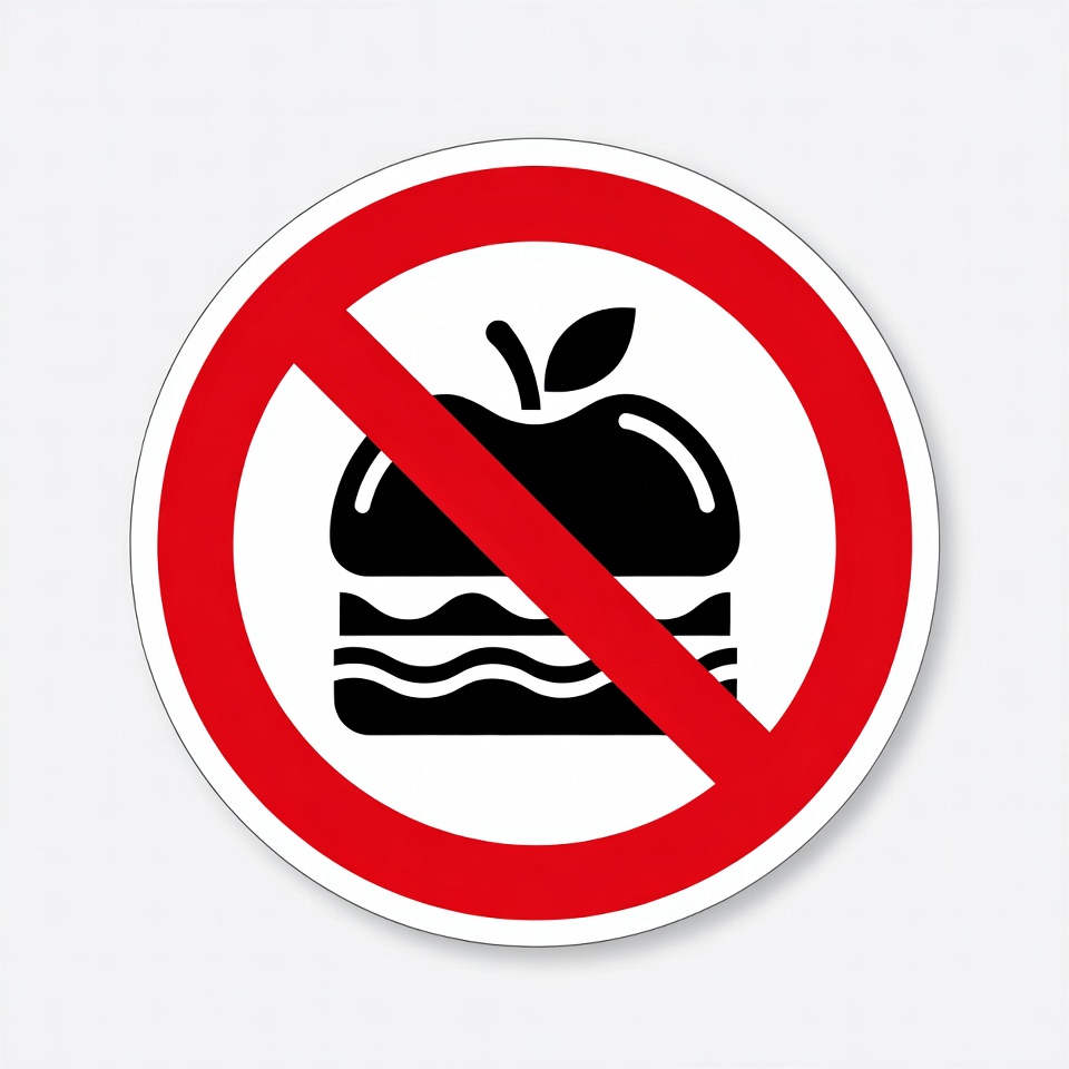 A red circular prohibition sign features black icons of an apple with a leaf and a burger crossed out by diagonal red lines. The apple is positioned at the top and the burger at the bottom within the white circle. The design uses simple vector graphics on an isolated background.