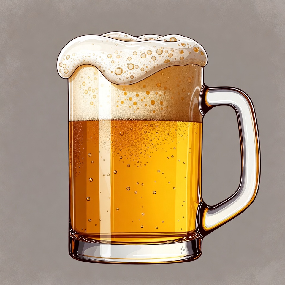 A detailed illustration of a clear glass mug filled with golden beer and overflowing white foam. The mug features a sturdy handle and sits against a plain gray background. Bubbles are visible in the foam and beer.
