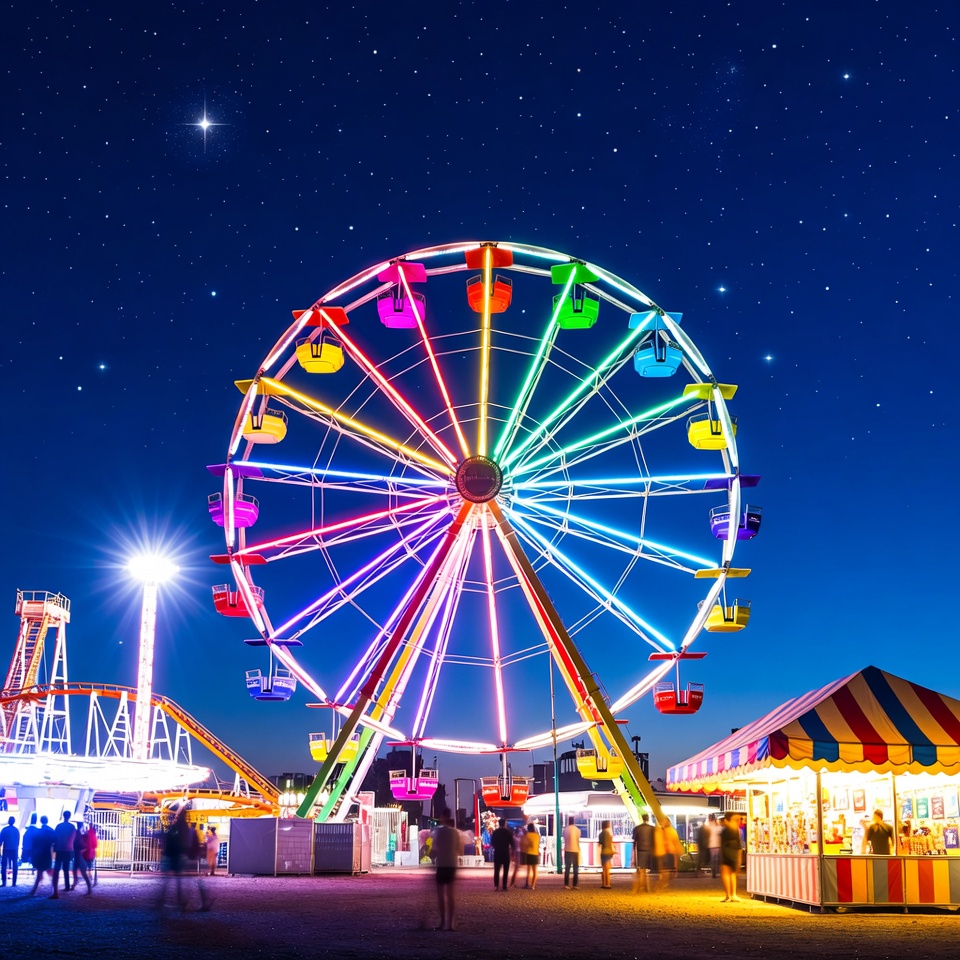 A vibrant Ferris wheel with multicolored lights glows against a starry night sky at a bustling carnival. Crowds of people stand blurred in the foreground near striped tents and other amusement rides illuminated by spotlights. The scene captures the lively atmosphere of a fairground with neon accents and festive stalls.