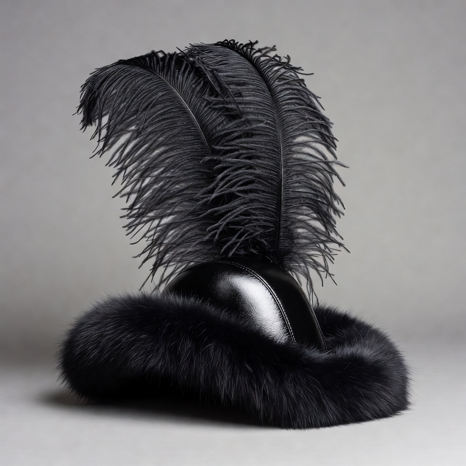 black feathers, black fur, black hat, fashion accessory, feather hat, fur trim, headwear, isolated background, leather hat, luxury hat, ostrich feathers, stylish hat, hat