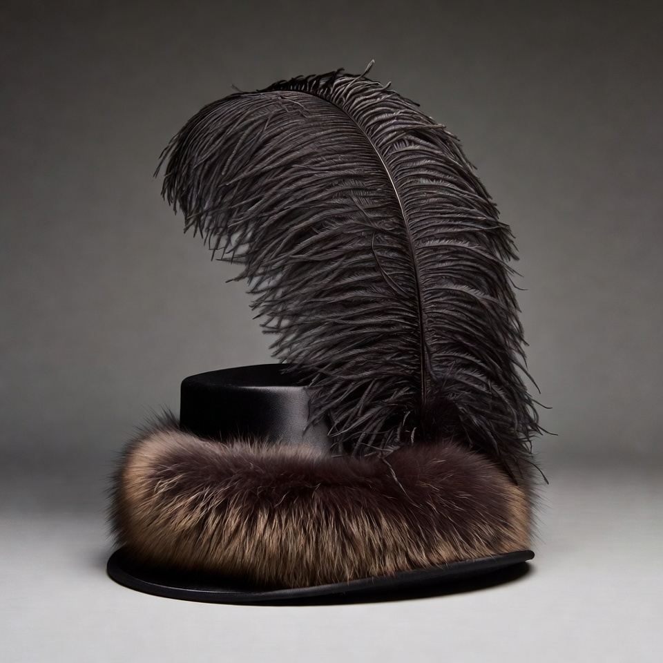 A black top hat features large curved ostrich feathers arching from the side. The hat has a fur-trimmed band around its base. It is displayed against a plain gray background.
