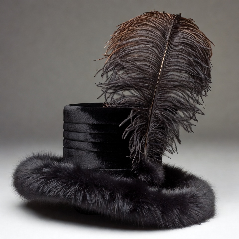 Victorian hat, black hat, brown feathers, elegant hat, fashion accessory, feathers, formal hat, fur trim, isolated background, luxury hat, mens hat, plume hat, topper hat, velvet hat, top hat