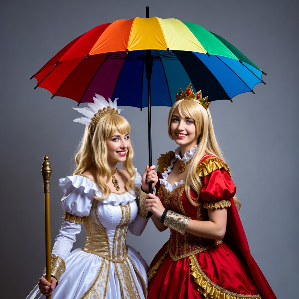 Two women in elaborate princess costumes, one in a white and gold gown holding a scepter, and the other in a red and gold dress, stand together holding a large rainbow-colored umbrella. Both have long blonde hair, feathered crowns, and smile at the viewer against a plain gray background. They wear ornate jewelry and puffed sleeves typical of royal attire.