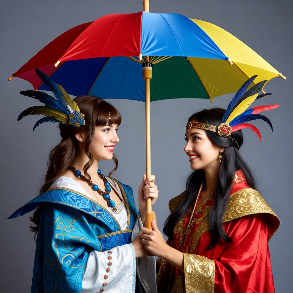 Two smiling women with feathered headdresses stand close together holding a large multicolored umbrella with red, blue, yellow, and green sections. The woman on the left wears a blue and white embroidered dress and necklace, while the one on the right is dressed in a red and gold outfit. They pose against a plain gray background.