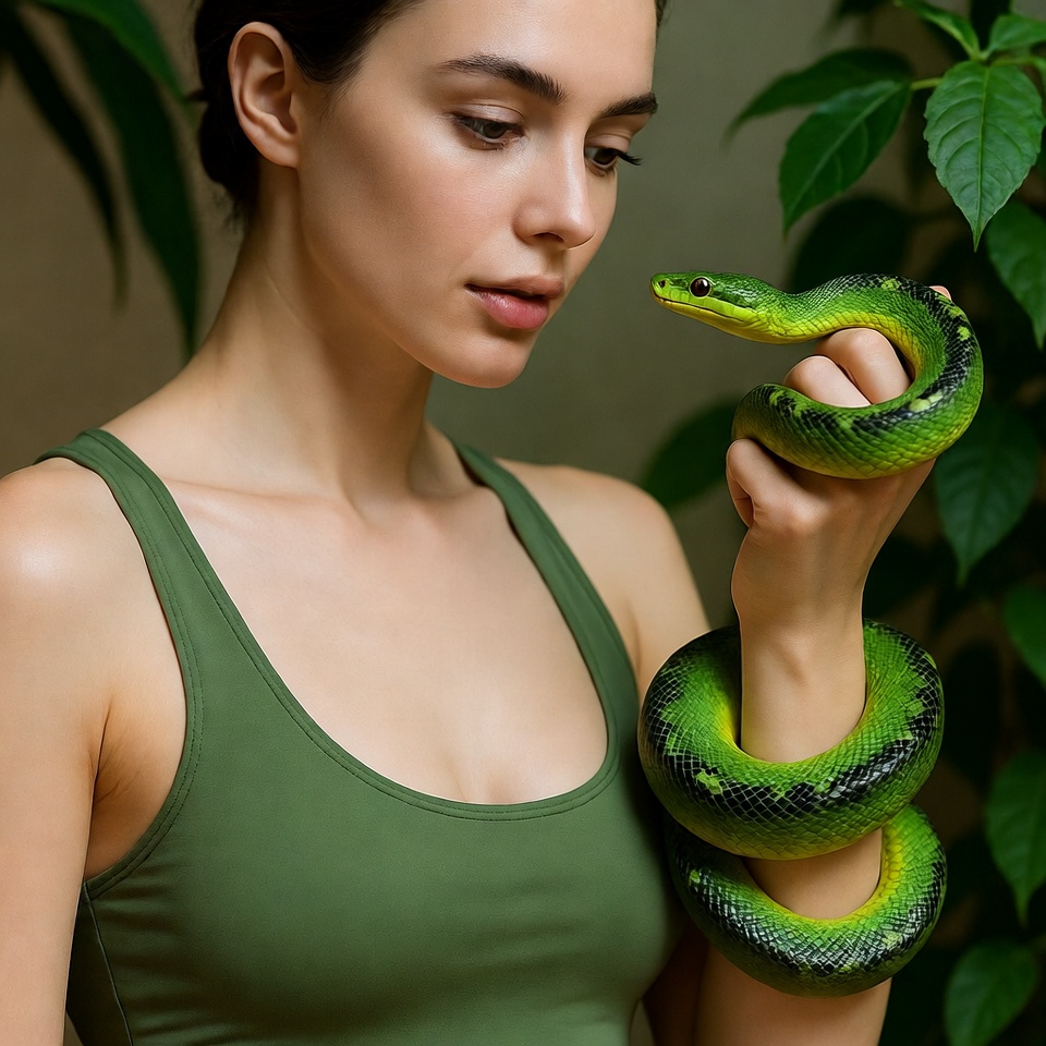 A young woman with dark hair in a bun holds a green snake coiled around her hand and arm. She wears a green tank top and gazes closely at the snake's face. Lush green plants form the background.