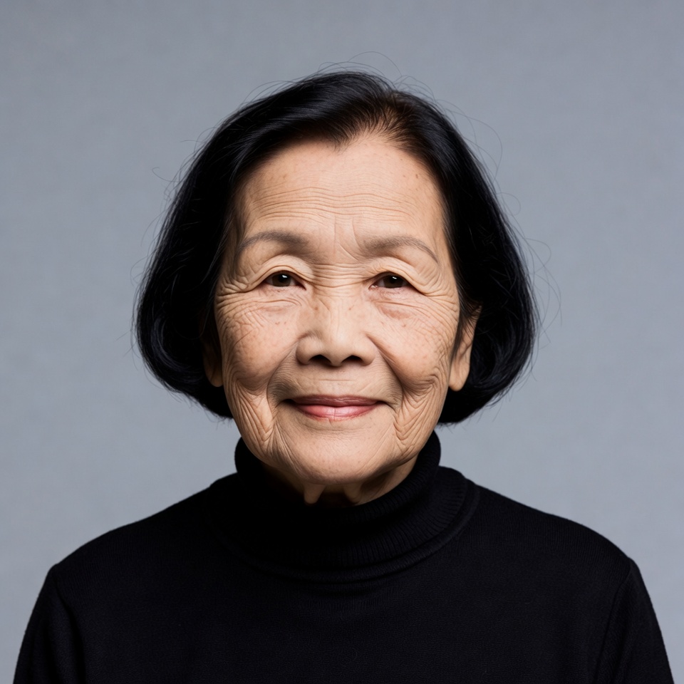An elderly Asian woman with short black hair smiles gently at the camera. She wears a black turtleneck sweater and stands against a plain gray background. Her face shows fine wrinkles and warm expression.