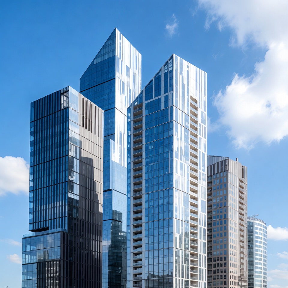 angular design, blue sky, cityscape, contemporary architecture, downtown, glass facade, high-rise, metropolis, modern buildings, reflective glass, steel architecture, tall buildings, urban skyline, white clouds, skyscrapers