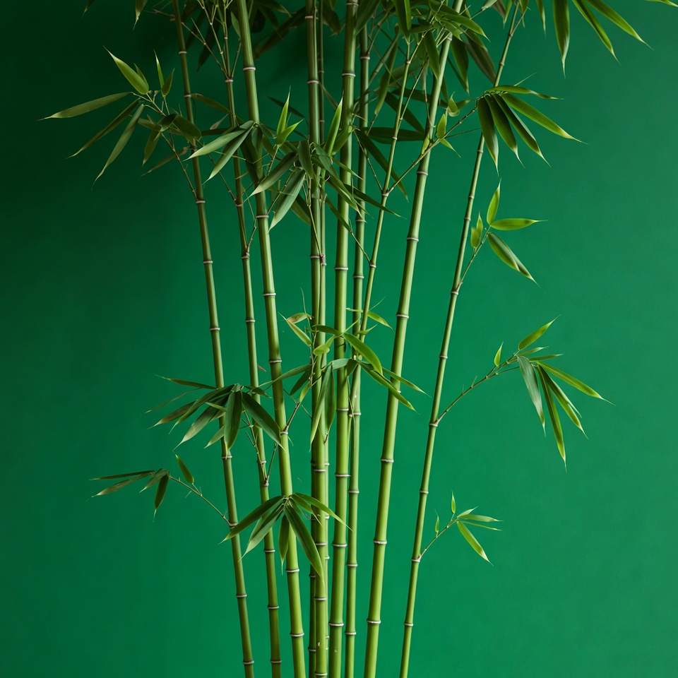 Tall green bamboo stalks with slender leaves stand clustered together. They are photographed against a solid green background, creating a natural contrast. The bamboo appears fresh and vibrant.