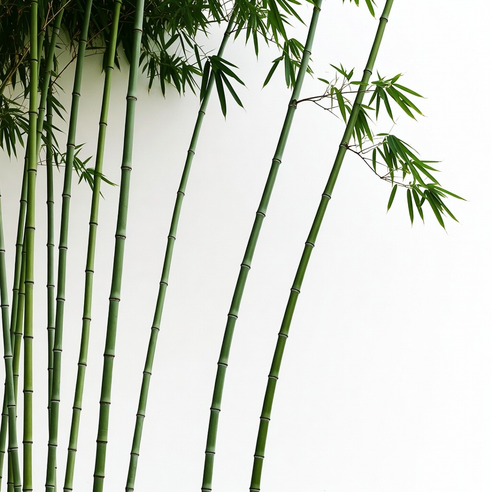 Tall green bamboo stalks with slender leaves stand vertically against a plain white background. The bamboo is arranged in a cluster, creating a natural and isolated composition. Fine details of the bamboo nodes and foliage are clearly visible.
