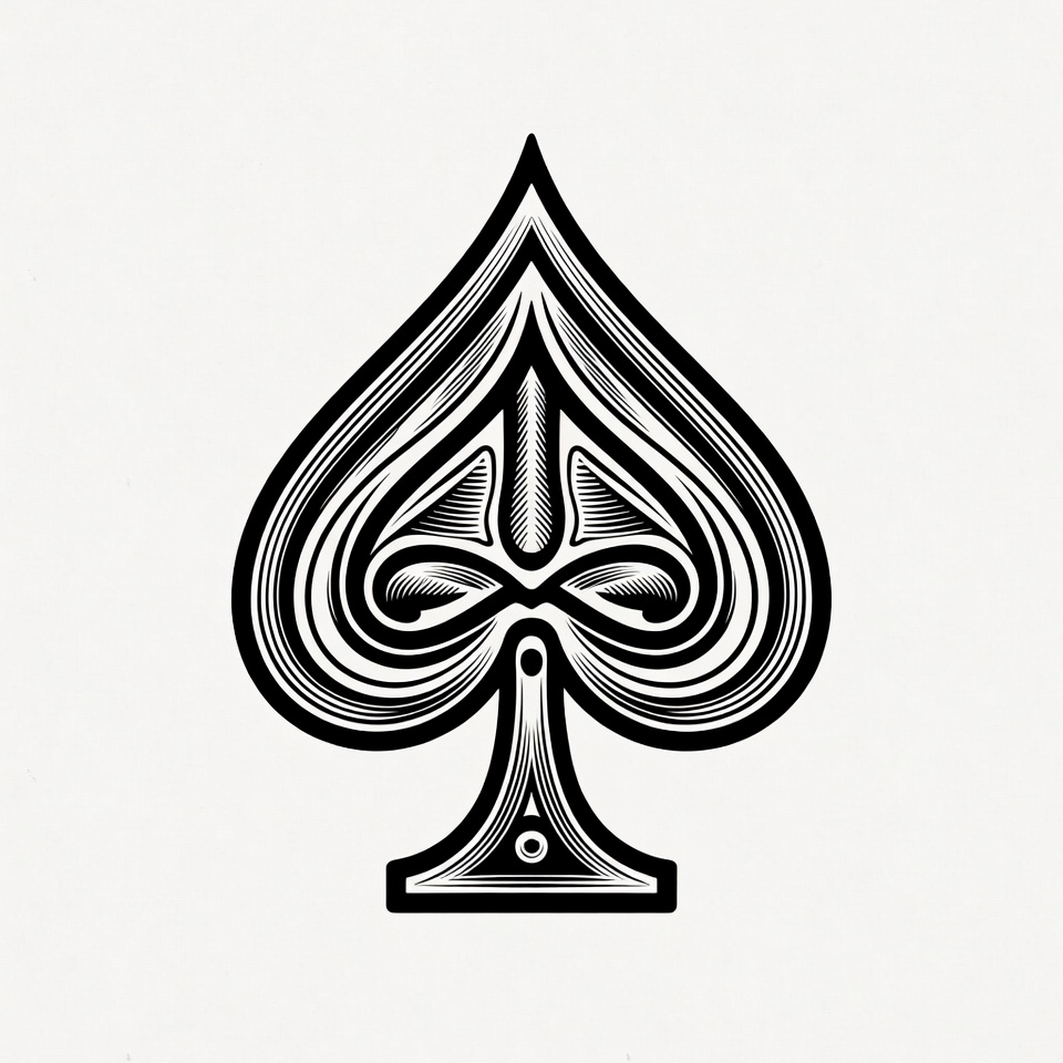 A detailed black spade symbol features intricate line art with swirling patterns and layered contours. The design is rendered in sharp black ink on a white background, emphasizing its bold, symmetrical shape. It resembles a stylized playing card suit with ornate engravings.