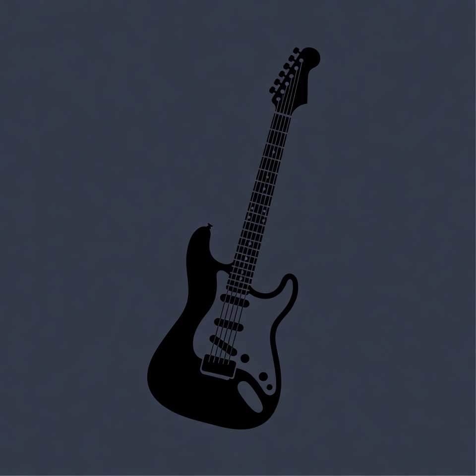 A black silhouette of a Fender Stratocaster-style electric guitar is depicted against a dark blue background. The guitar features a double-cutaway body, three pickups, a headstock with tuning pegs, and a neck with frets. It is presented in a simple, isolated outline illustration style.