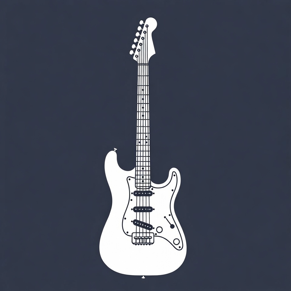 Fender guitar, Stratocaster, clipart, double cutaway, frets, guitar illustration, isolated background, line art, musical instrument, navy background, pickups, rock guitar, string instrument, tremolo, white guitar, electric guitar