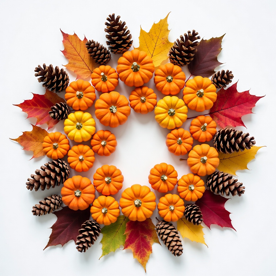 autumn leaves, autumn wreath, circular design, cones, fall decor, fall leaves, foliage, harvest wreath, holiday decoration, nature elements, orange leaves, orange pumpkins, pinecones, red leaves, seasonal decor, small pumpkins, symmetrical wreath, thanksgiving wreath, white background, yellow leaves, pumpkin wreath