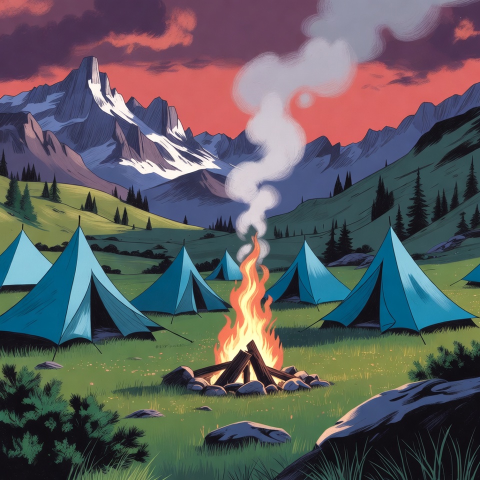 A vibrant illustration depicts a glowing campfire in a grassy valley surrounded by several blue tents. Snow-capped mountains rise dramatically in the background under a twilight sky with swirling smoke from the fire. Pine trees and rocks dot the lush green landscape.
