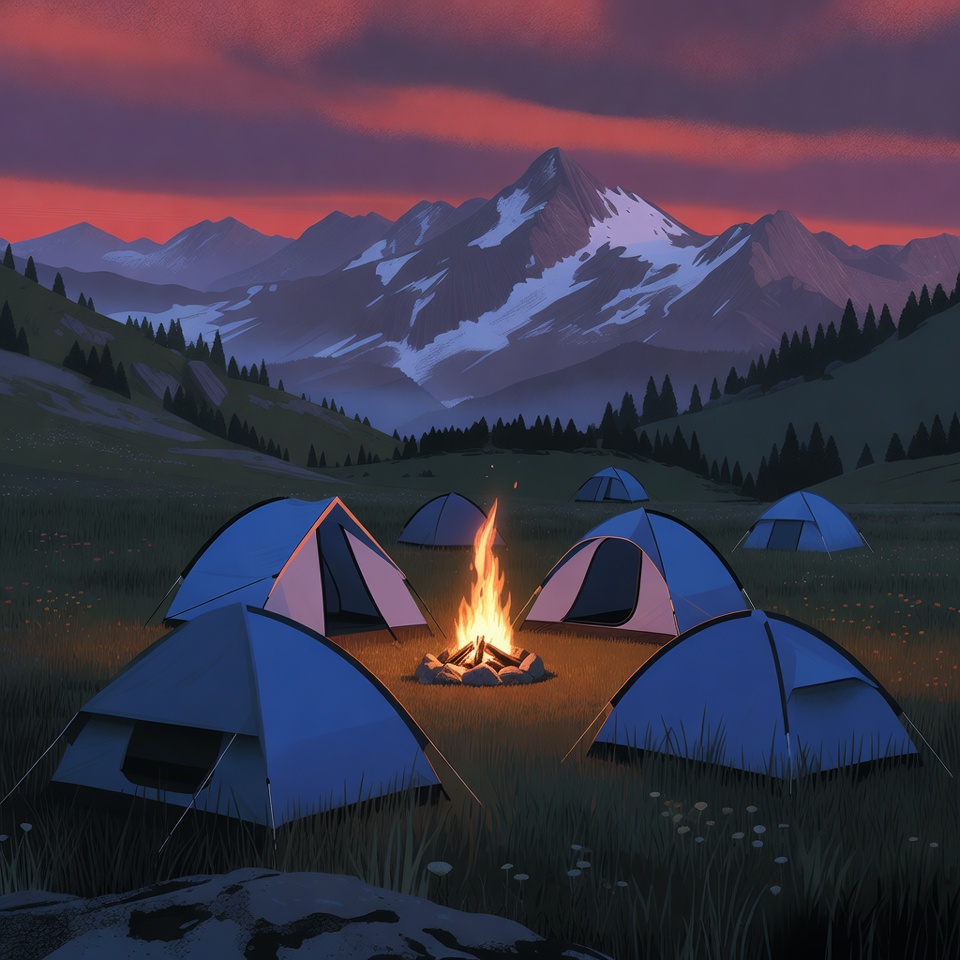 Several blue tents surround a glowing campfire in a grassy meadow at sunset. Snow-capped mountains rise in the background under a vibrant purple and orange sky. Pine trees dot the green hillsides in this digital illustration.