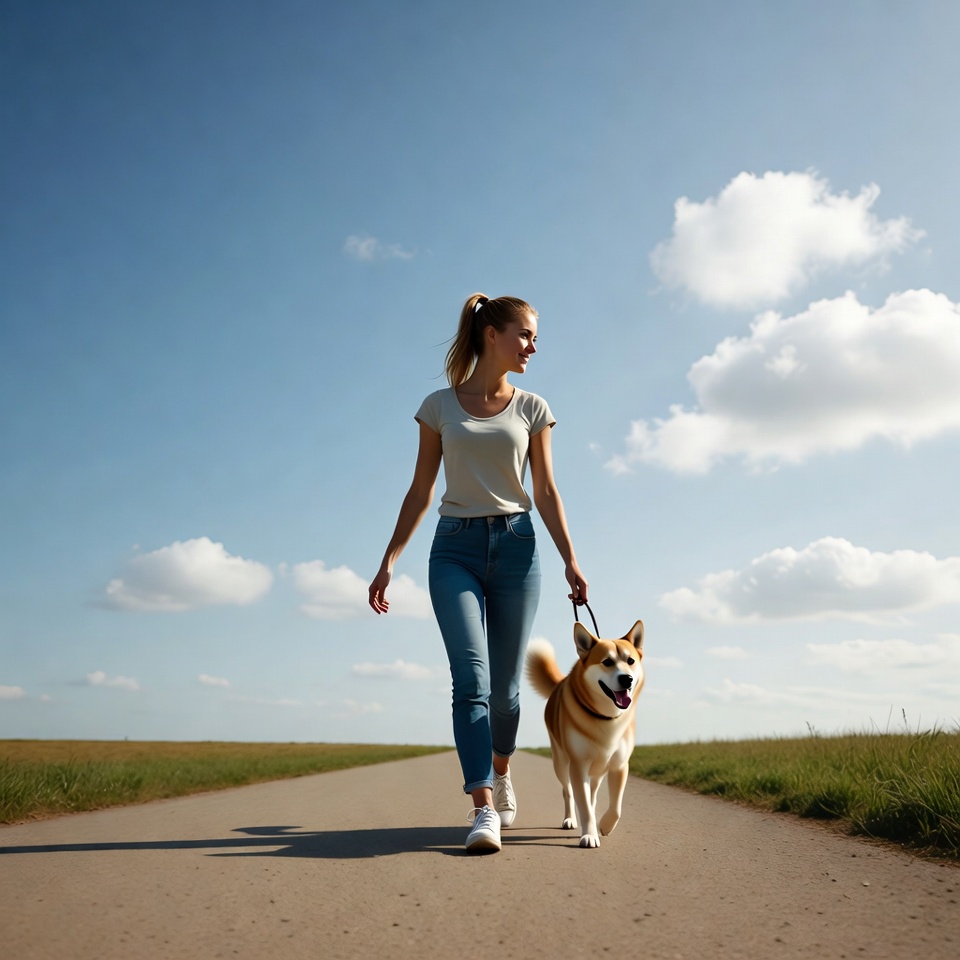 A young White woman with blonde hair in a ponytail walks her Shiba Inu dog on a rural road. She wears a light gray t-shirt, blue jeans, and white sneakers while holding the leash. The scene features a clear blue sky with white clouds and green fields on both sides.