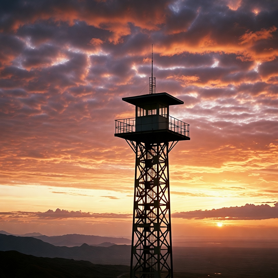 A tall metal watchtower stands silhouetted against a vibrant orange and purple sunset sky filled with dramatic clouds. The structure features a small enclosed platform at the top with railings and an antenna. Distant mountains and a hazy valley are visible below.