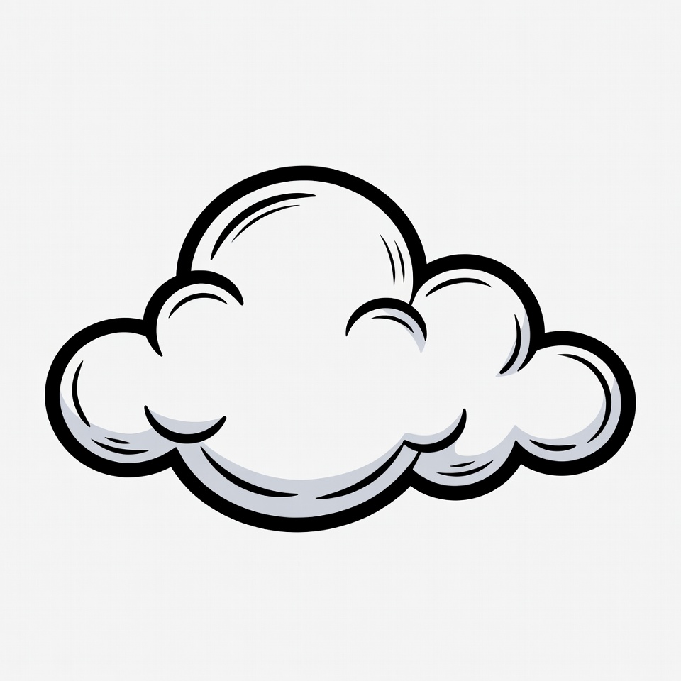 A simple white cloud is depicted in a cartoon style with bold black outlines. It features a puffy, rounded shape with multiple soft bulges. The cloud is isolated on a transparent background.