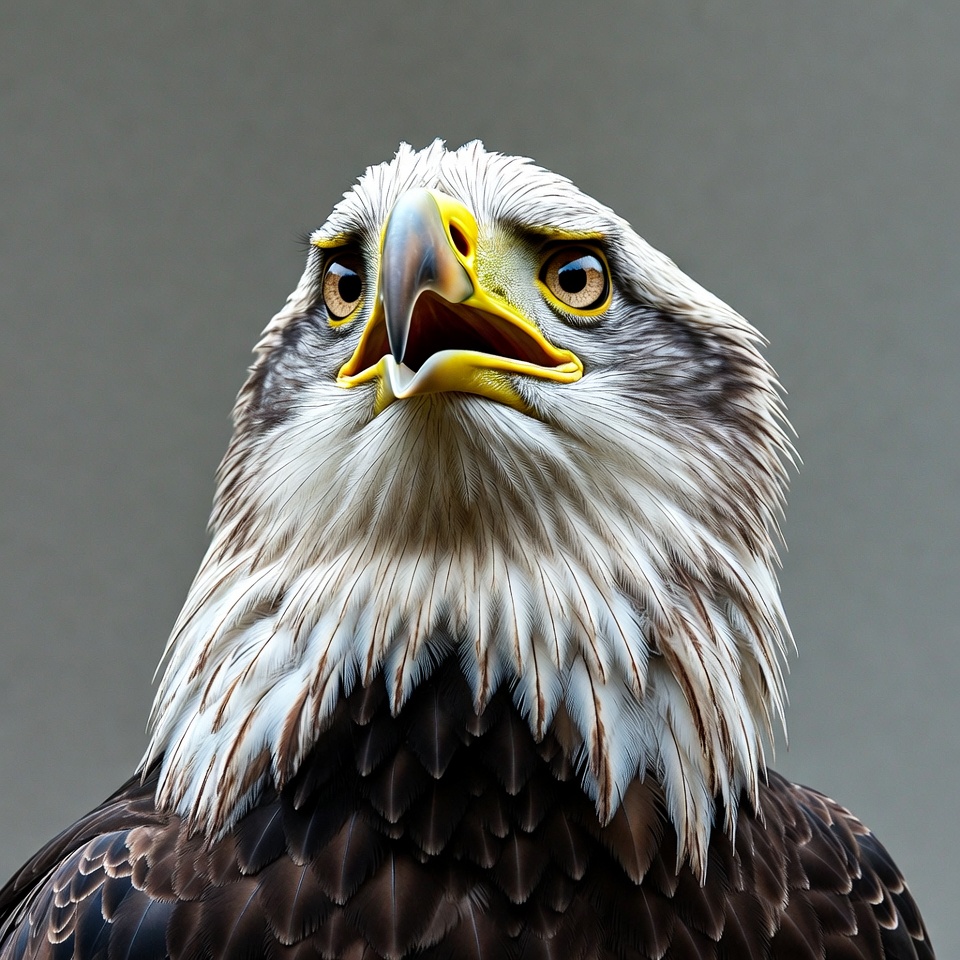 A majestic bald eagle faces forward with intense yellow eyes and an open beak. Its white head feathers contrast with the dark body feathers. The bird is isolated against a plain gray background.
