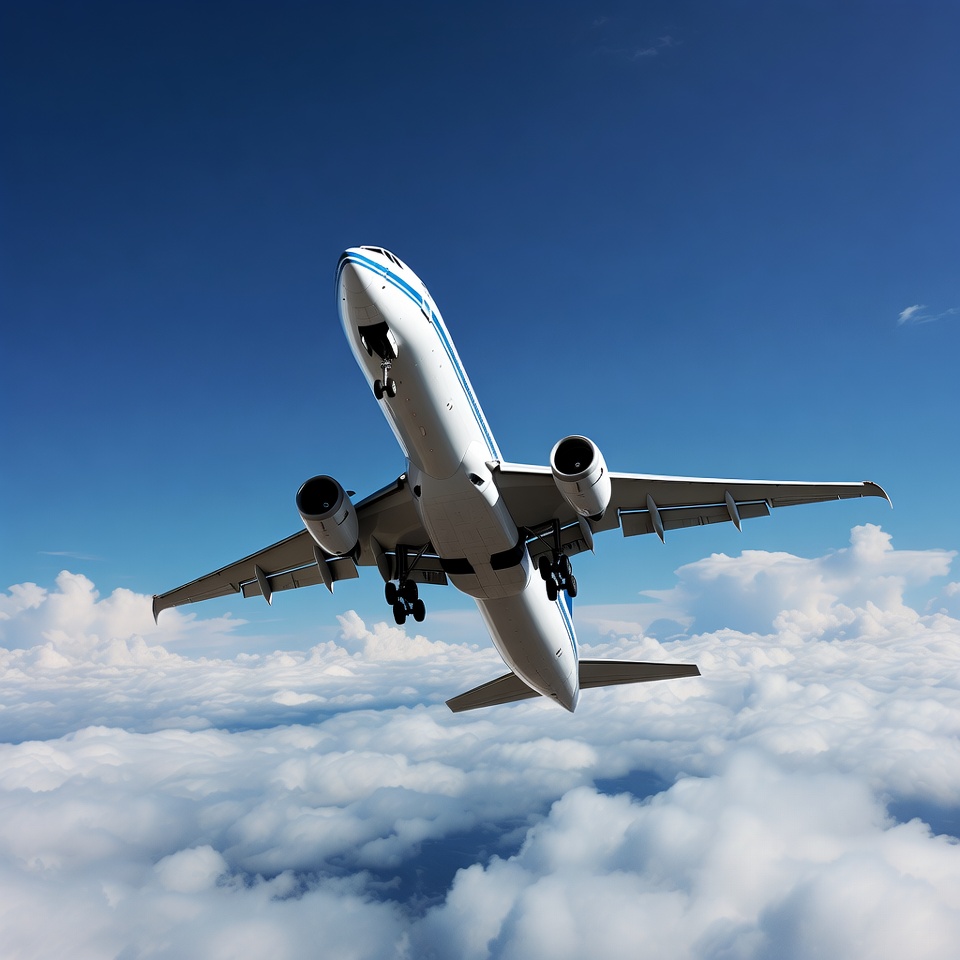 A large commercial airplane with white fuselage and blue stripes flies upward through a bright blue sky filled with fluffy white clouds. The aircraft is captured from below, showcasing its engines, wings, and landing gear clearly. The perspective emphasizes the plane's ascent above the cloud layer.