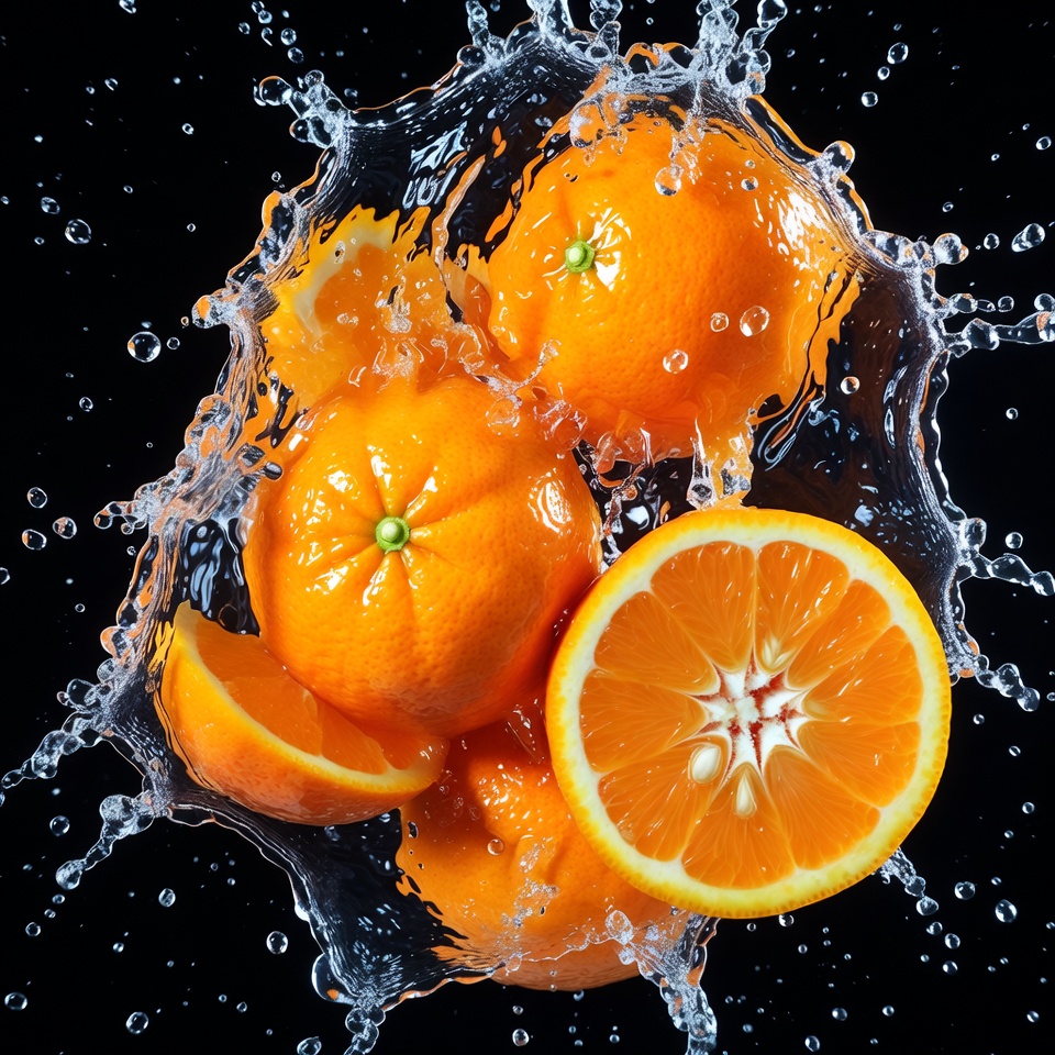 Fresh oranges and orange slices splash dynamically in water against a black background. Water droplets fly outward from the vibrant citrus fruits. The image highlights the juicy texture and bright orange color of the fruits.