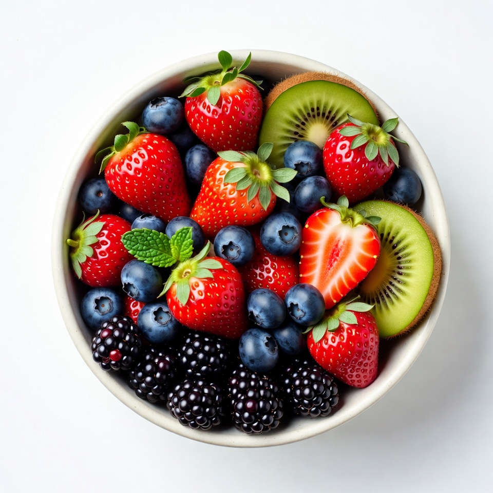 A white bowl filled with fresh strawberries, blueberries, blackberries, and sliced kiwis sits on a white background. Vibrant red strawberries, green kiwi slices, and clusters of blueberries and blackberries create a colorful mix. Mint leaves garnish the top of the fruit salad.