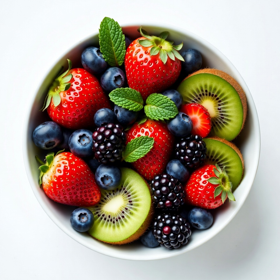 A white bowl filled with fresh strawberries, blueberries, blackberries, and kiwi slices. Green mint leaves garnish the top of the vibrant fruit mix. The bowl is viewed from above on a plain white background.